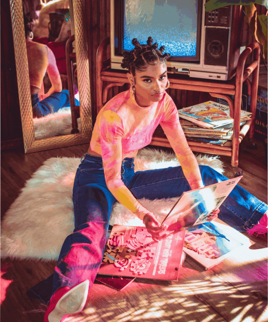 The setting makes it feel even more nostalgic with the fuzzy white rug, old-school vinyl records, and vintage TV buzzing in the background. It’s giving retro cool. If you’ve ever wanted to dress like you’re starring in your own 90s music video, this look is basically your blueprint.