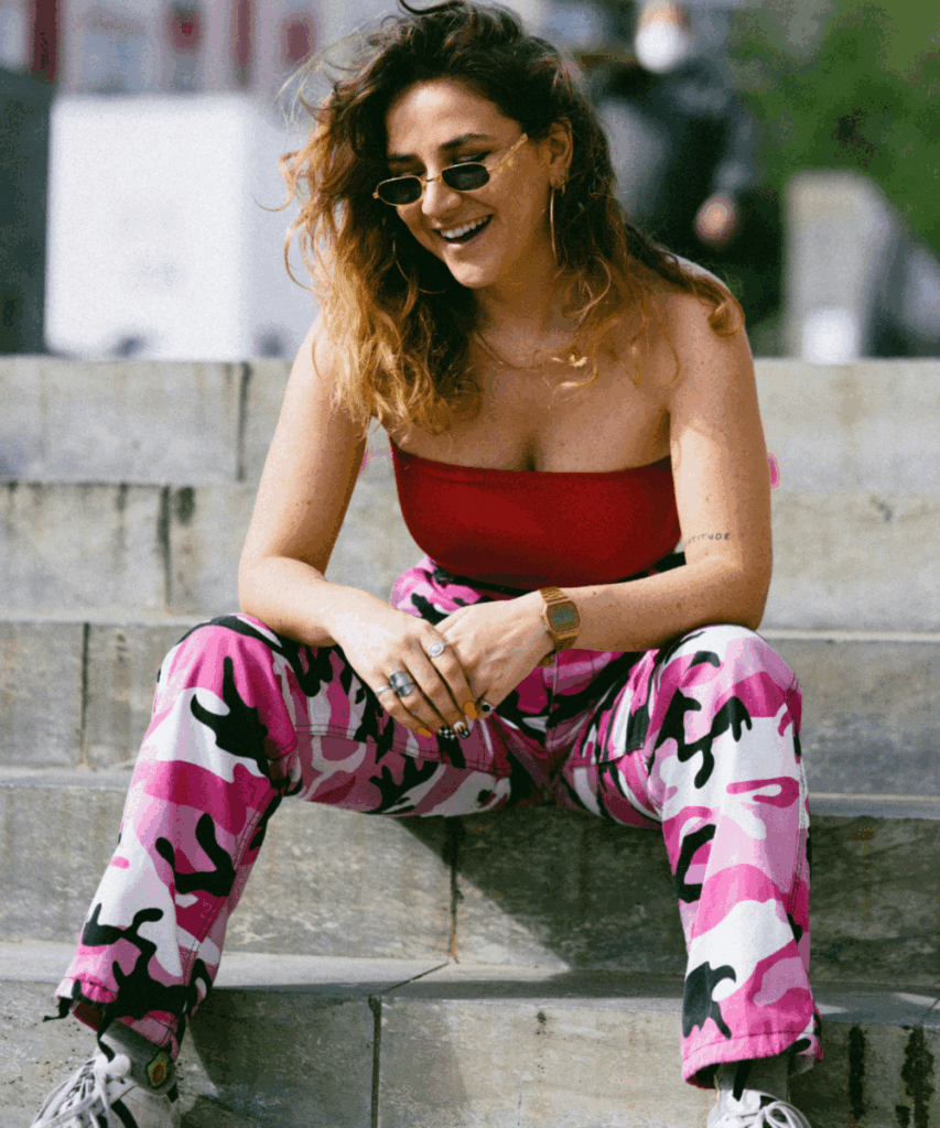 Camo pants were a 90s staple, but seeing them in this bright pink twist is so fun and fresh. The contrast between the loud pants and the simple red tube top is so good it keeps the look playful but balanced. The tiny sunglasses and chunky rings…they’re such fun little throwback touches that make the outfit even more memorable.