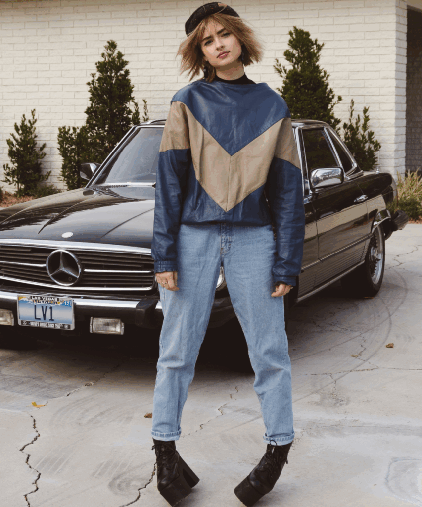 This jacket has serious attitude. The bold color blocking, the structured shoulders, the way it’s paired with relaxed high waisted jeans, it’s giving rebel energy. That slightly messy hair and confident stance make it all feel even more authentic, like something you’d see in an old music video or magazine editorial.