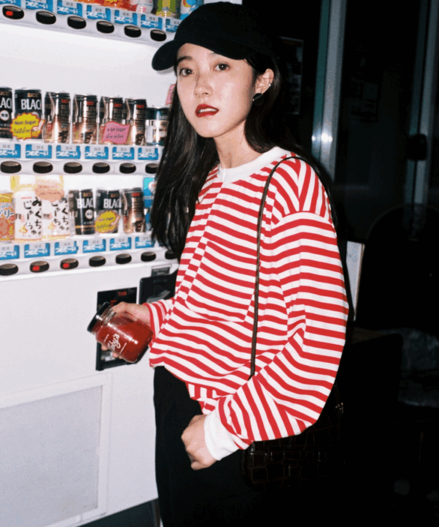 There’s something about a striped long sleeve like this that feels so 90s cool and comfy. The red and white combo, the loose fit, and the laid back black baseball cap give it that effortlessly chill vibe, like she just stepped out of a movie scene or a night out in the city. It’s minimal, but it still stands out.