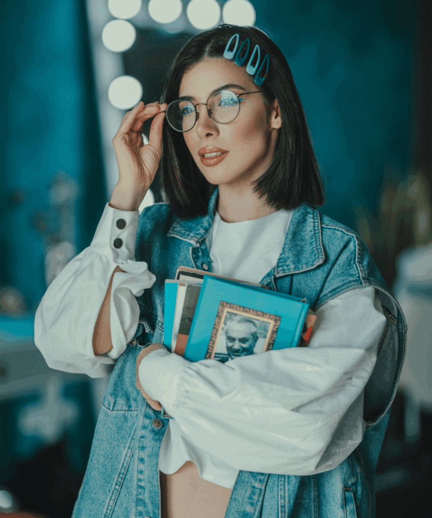 I can’t get enough of the layering happening here…it’s smart, stylish, and super nostalgic. The oversized white blouse underneath a sleeveless denim vest instantly reminds me of old school classroom fashion. Those round glasses and colorful hair clips, and it becomes a total 90s school throwback with a grownup twist.