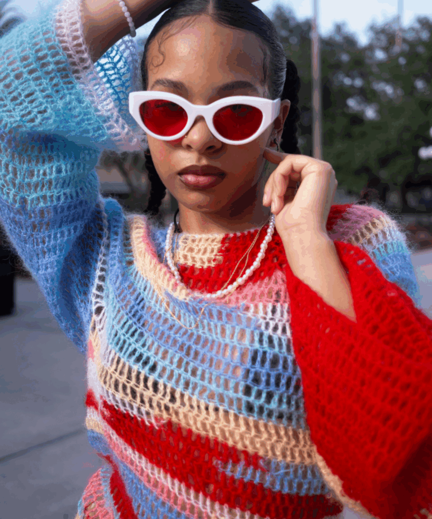 This sweater is such a showstopper. The open knit rainbow texture mixed with bold red sleeves is already eye catching, but adding those white and red cat-eye sunglasses makes it into a fashion moment. I love how everything about this look is a little exaggerated, a little dramatic, and a whole lot of fun.