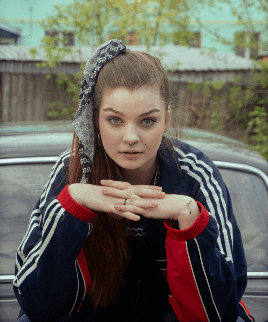 There’s so much to love here, from the sporty windbreaker to that high side ponytail with a logo printed ribbon…it’s giving pure 90s attitude. The bold stripes, the red accents, and the confident pose make this look feel like a mix between streetwear and vintage track star, and I’m obsessed with how strong it feels.