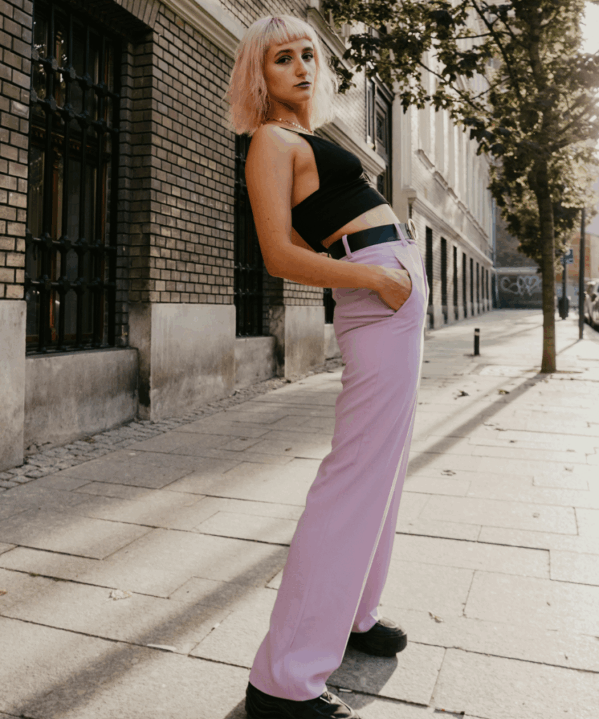This outfit brings such a cool contrast of soft and strong, and it’s totally working. The cropped black tank and black platform shoes are giving grunge energy, while the pastel pink pants add that unexpected pop of softness. The thick belt gives it structure, and the overall combo feels bold without trying too hard.