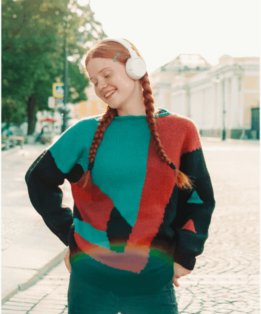 This entire look is just so happy. The bold colorblock sweater is giving major vintage feels with its mix of teal, red, and navy, and it’s paired perfectly with braided pigtails and oversized headphones. It’s cozy, bright, and totally has that carefree 90s vibe.