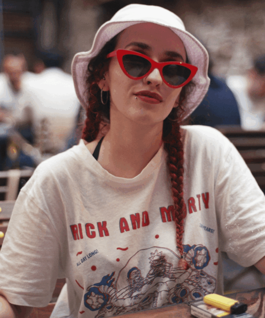 Talk about a vibe…this look is full of attitude. The oversized Rick and Morty tee feels lived in and laid back, but it’s the accessories that really steal the show. The bucket hat, hoop earrings, and those bold red cat-eye sunglasses come together like they were meant to.