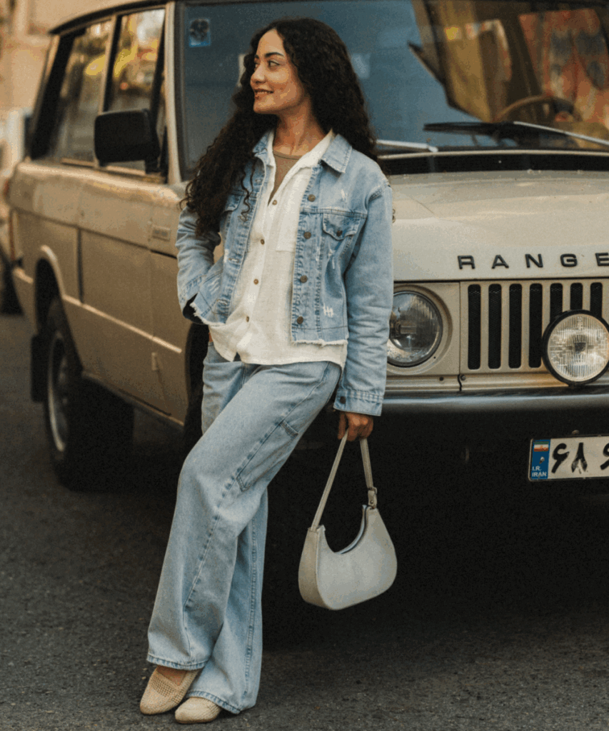 A denim on denim look feels like the best kind of throwback. The cropped jacket and wide leg jeans make a perfect pair, and the off white button down underneath adds a little texture and softness. I really like how the whole thing is styled to feel super chill but still pulled together.
