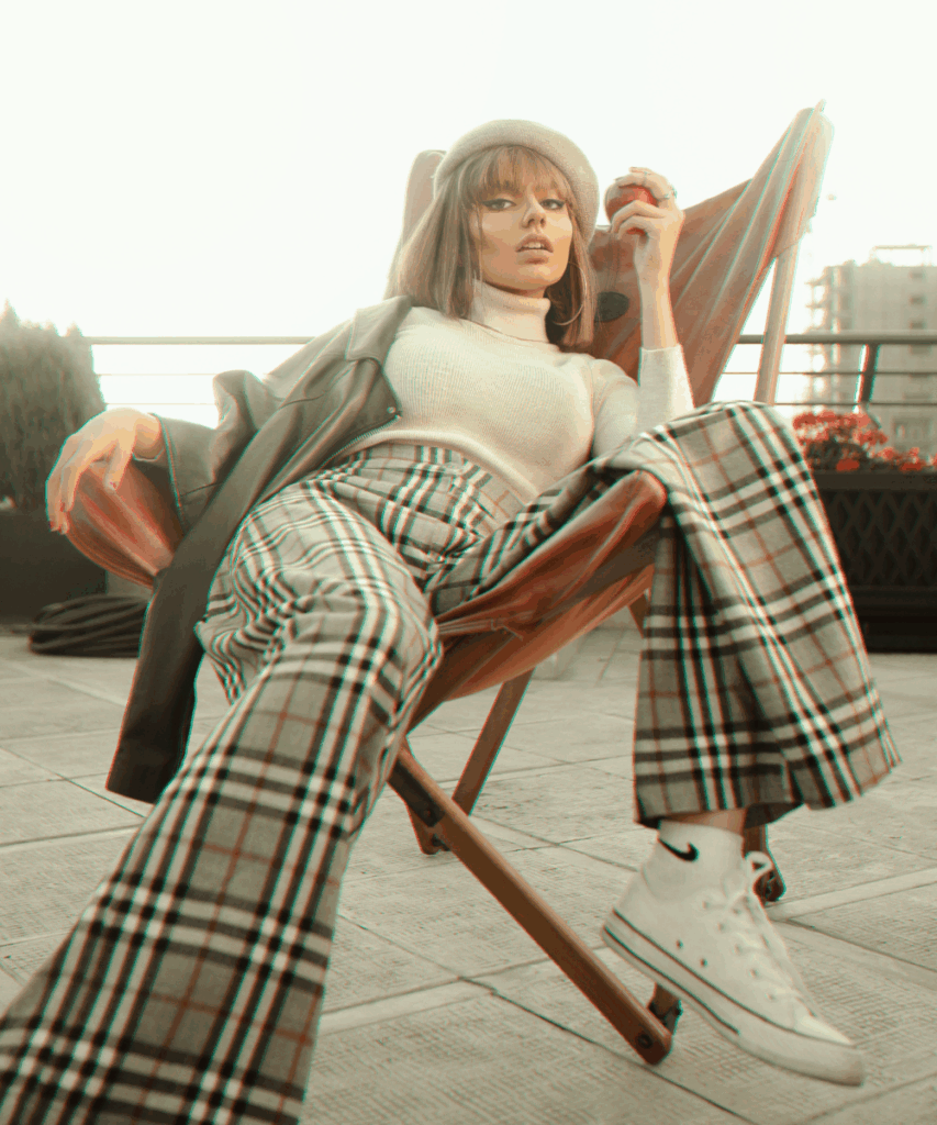 I’m obsessed with how this outfit turns a turtleneck and plaid pants into something that feels straight out of a fashion shoot. The wide leg pants are giving vintage prep, and the white high top sneakers bring in that streetstyle comfort. Layering a leather jacket on top and adding a beret just takes it to the next level.
