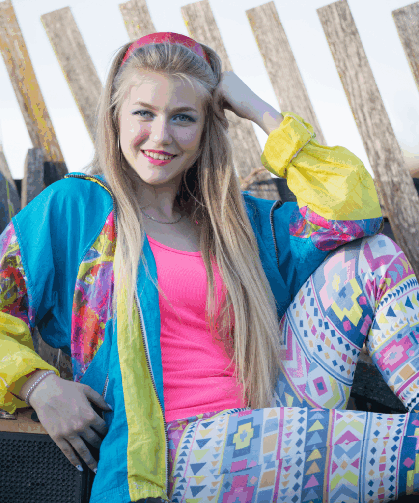This look is like a burst of happiness in outfit form. From the bright neon pink tank to those ultra colorful patterned leggings and the graphic windbreaker, every piece here screams fun. It’s such a playful nod to that fearless 90s style, where more color was always better, and nothing had to match perfectly to make sense.