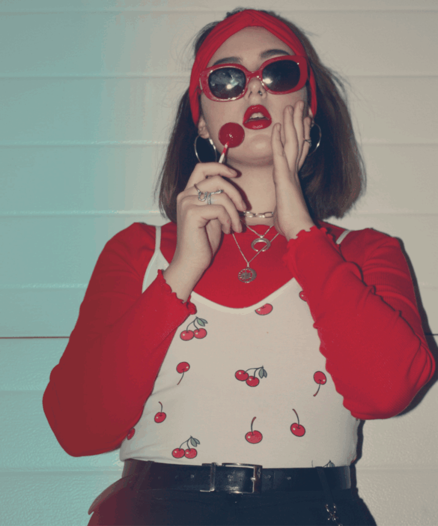 This one gives me all the teen dream vibes from back in the day. The cherry printed tank layered over a fitted red top is such a fun combo, and the chunky silver accessories and oversized red sunglasses add that edgy twist. The slick red headband and bold lipstick has a whole cool girl aesthetic going on.