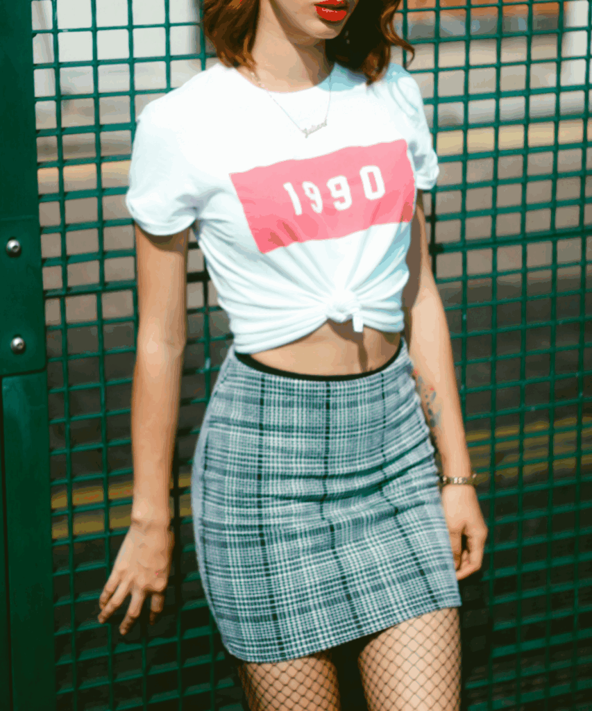 There’s just something so timeless about plaid and a mini skirt, especially when styled like this. The knotted graphic tee adds the perfect relaxed touch to balance the more structured skirt, and those fishnet tights underneath are a cool detail that makes it more fun and edgy. Total 90s It Girl energy.
