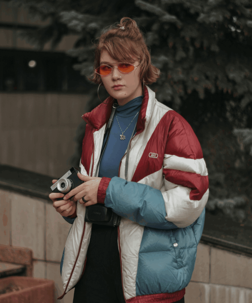 This jacket is such a classic throwback piece, it reminds me of those big, puffy coats everyone had in the 90s. The red, white, and blue color blocking is so nostalgic, and paired with orange tinted sunglasses and a film camera, it instantly gives me cool vintage vibes. The blue turtleneck underneath ties everything together.