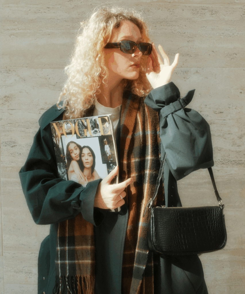 There’s something so timeless about oversized coats and structured layers, and this look captures that perfect fashion forward 90s attitude. The plaid scarf draped over a dark trench gives me all the cozy but elevated vibes. Those tiny rectangle sunglasses are a total win in the accessories department. With a Vogue mag in hand and a croc texture shoulder bag, this outfit will make you feel like you’re headed to a casting call.