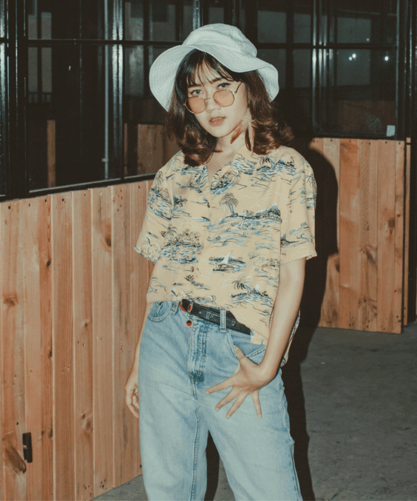 A tee with light blue jeans was all the vibe back then. The oversized Hawaiian shirt tucked into high waisted jeans is such a playful nod to 90s casual wear yet looks super chic. That floppy bucket hat and tiny round sunglasses gives the perfect mix of quirky and cool.