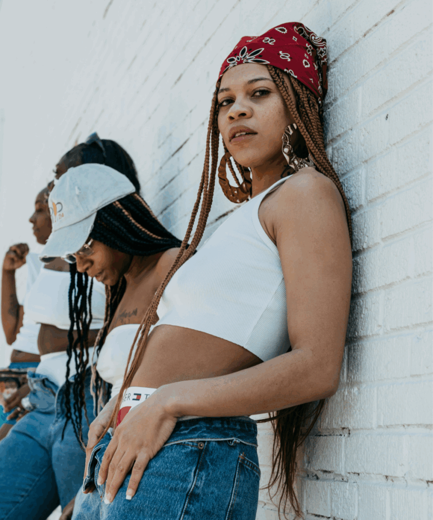This entire vibe is pure 90s hip-hop influence and it seriously takes me back to my old neighborhood. The white crop top, low-rise jeans, and peek of the Tommy Hilfiger waistband were a classic. The red bandana paired with big gold hoops and box braids is such an iconic look, it gives off power, confidence, and style.
