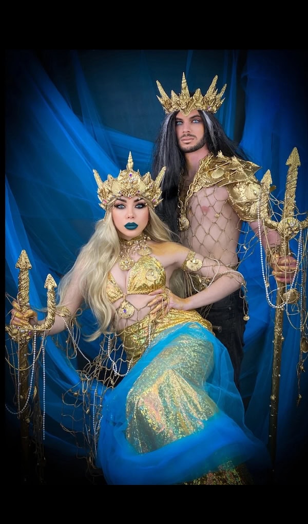 This ocean queen and king costume is incredible! Serve Poseidon realness with shimmering scales, trident flair, and crowns that say “we rule the sea AND the party.” Get everything you need for this awesome couple’s costume here: