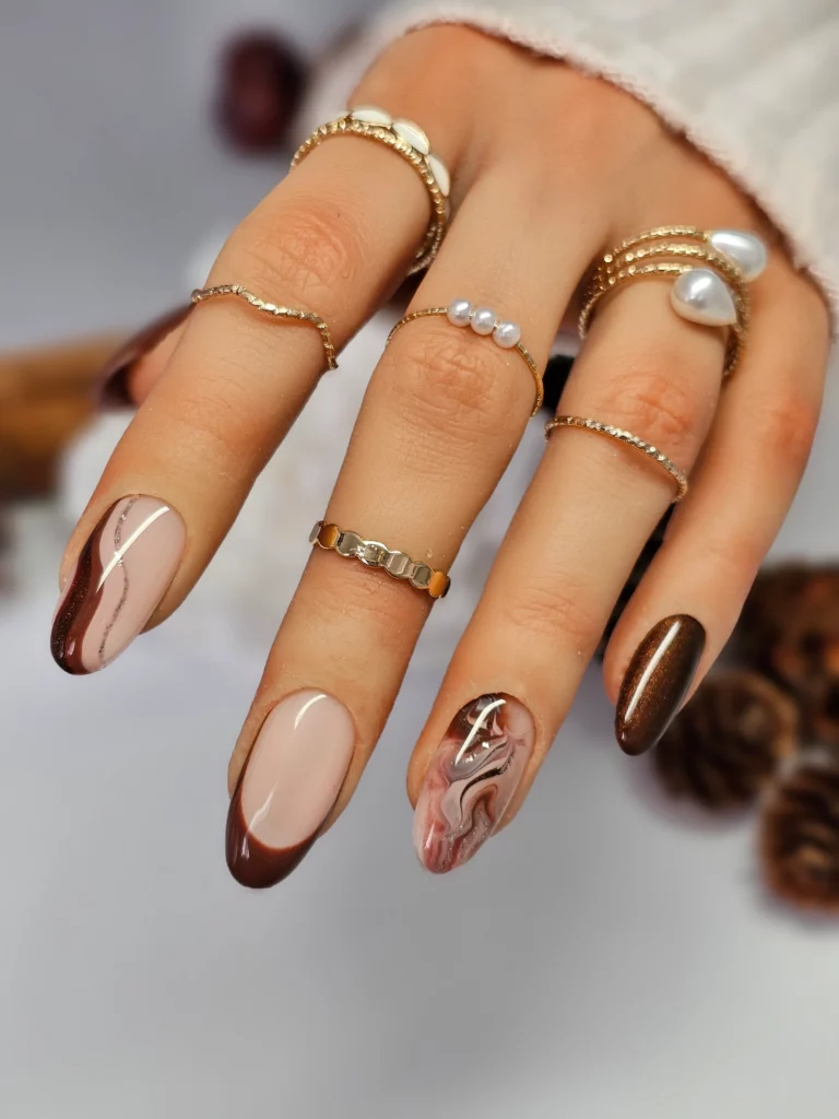 Chocolate brown swirls paired with soft nude tones and a hint of marble create a look that feels both modern and cozy. The glossy finish adds a touch of shine, giving the nails a polished vibe perfect for fall. Marble details bring in a bit of artistry without being too dramatic. Altogether, it’s a design that feels sophisticated but still relaxed.