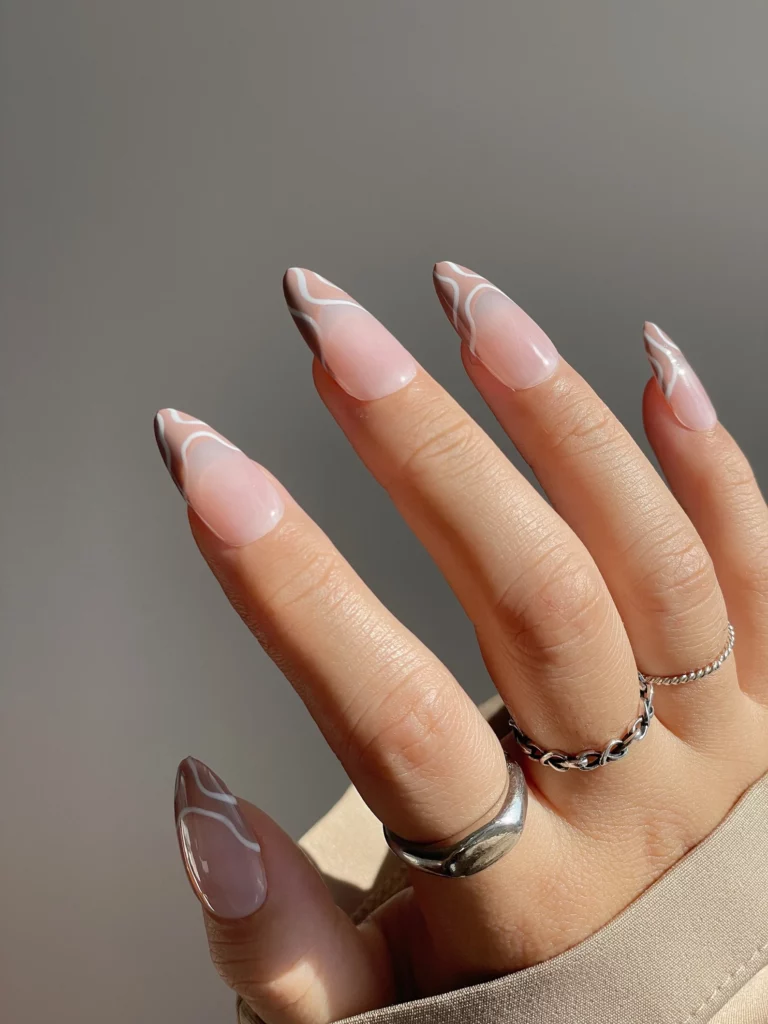 Soft nude nails with flowing taupe and white wavy lines create a gentle, modern look. The curved shapes feel elegant and fresh, adding just a bit of visual interest without overwhelming the design. It’s a style that feels airy and light, perfect for transitional fall days. The waves bring a calming vibe that suits a more minimal aesthetic.