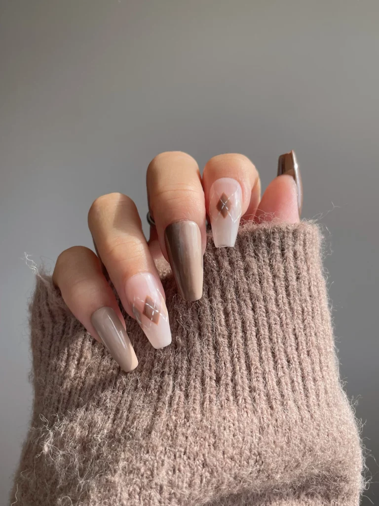 A creamy taupe base paired with argyle plaid accents brings a cozy, nostalgic feel that’s ideal for fall. The plaid pattern adds a touch of vintage charm without being overly bold. Soft colors keep the look gentle and wearable, making it feel sophisticated but still playful. The result feels like your favorite fall sweater translated into nail art.