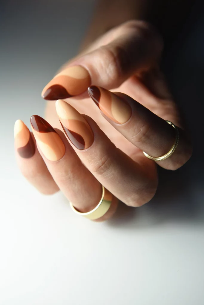 Retro-inspired waves in shades of caramel, chocolate, and beige create a fun and nostalgic nail design for fall. The flowing lines feel playful and bring in a touch of vintage style that’s making a comeback. It’s a look that feels both stylish and a bit soft, without being too loud. The color combination stays firmly in the fall palette, keeping things cohesive.