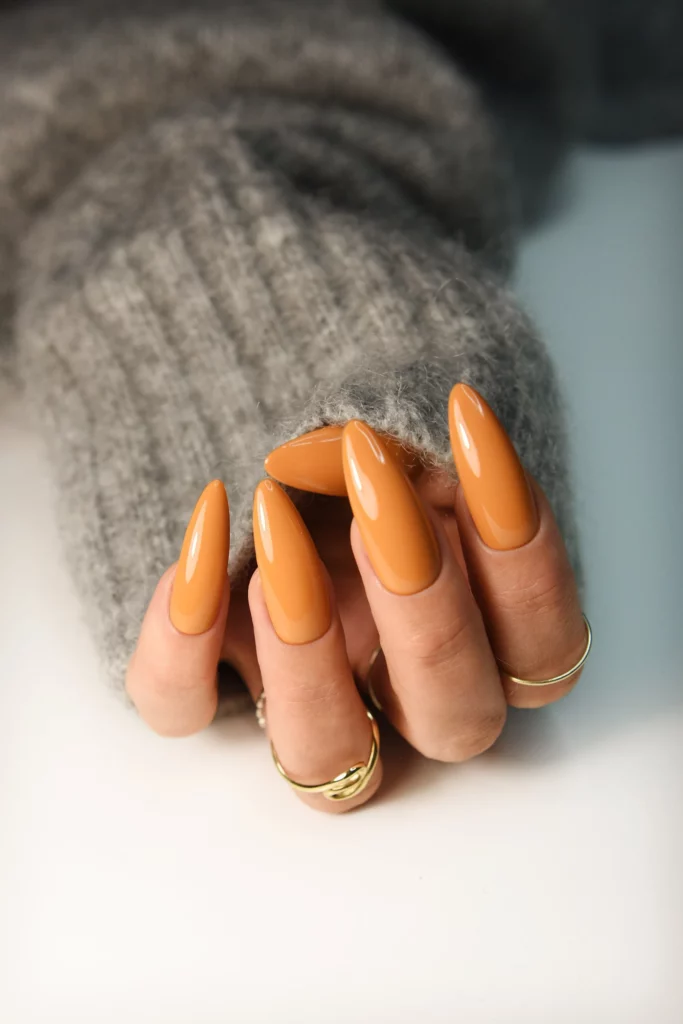 Nothing says fall quite like the warm, inviting color of pumpkin spice. A glossy, caramel-orange polish makes this manicure feel lively and seasonal without being overwhelming. The almond shape keeps the look elegant, making it feel grown-up rather than overly playful. The color looks vibrant and cozy all at once.