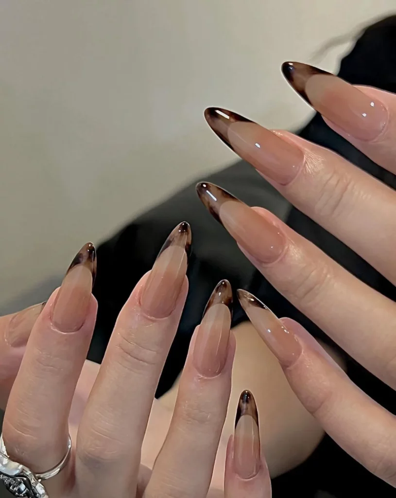 A smoky French tip in a deep espresso shade creates a subtle yet dramatic effect on your nails. The gradient fade from dark brown into a sheer nude base makes the design feel soft and modern rather than harsh. It’s the kind of manicure that has depth and elegance without being too bold. The finish looks smooth and refined, perfect for cooler weather.