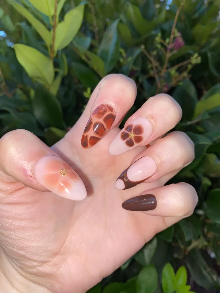 Combining floral designs with tortoiseshell patterns makes for a unique and artistic nail look. Each finger has its own detail, blending warm autumn browns with delicate flowers and touches of gold. The result feels intricate but still cohesive, perfect for anyone who loves creative nail art. It’s like a little piece of art on each nail.