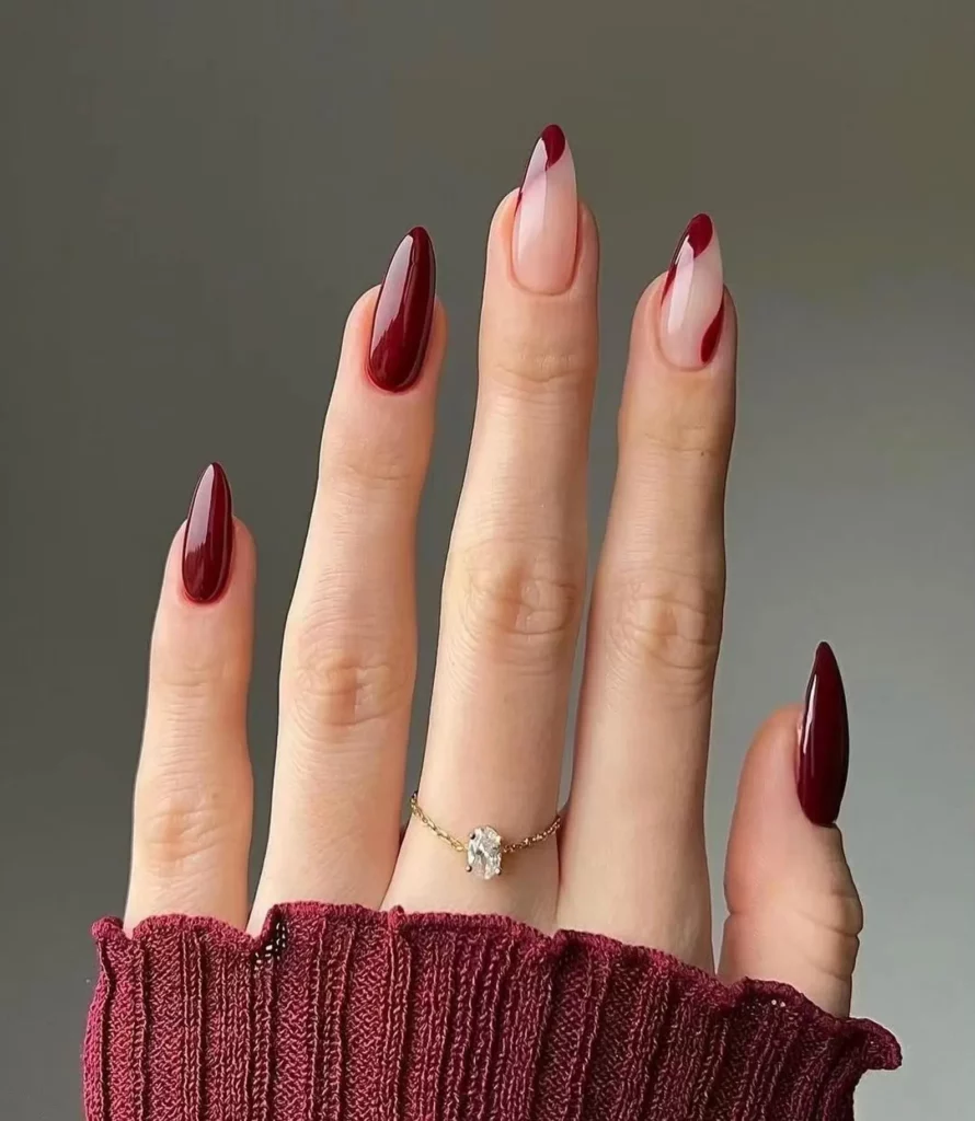 Deep burgundy nails with sweeping wave designs bring a bold yet sophisticated edge to your fall look. The mix of solid glossy color and curved accents on a sheer base keeps the design modern and fresh. It’s a beautiful way to wear a rich fall shade while adding some subtle movement and flair. The deep color has a warmth that’s perfect for cooler months.