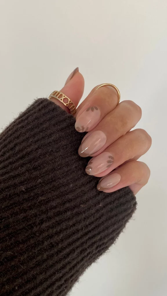 Soft taupe petals scattered across a sheer nude base create a delicate, nature inspired look that’s subtle yet interesting. The gentle floral design feels calming and elegant, offering a refined way to bring a bit of the outdoors into your manicure. Taupe shades keep the look neutral and versatile while adding depth and texture. It’s a beautiful option for fall without leaning into darker colors.