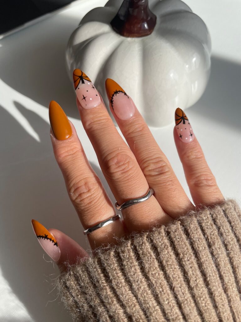 Nails decorated with tiny pumpkins, stitching details, and bright mustard accents create a fun, themed look for fall. The combination of patterns and colors feels cheerful and playful, reminiscent of visits to pumpkin patches or autumn festivals. It’s a manicure that leans into the spirit of the season, full of personality and charm. The designs are detailed but still small enough to keep the overall look wearable.