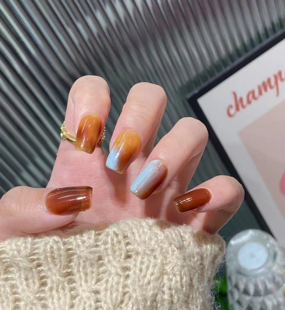 Swirls of caramel and soft sky-blue shades create a marbled effect that’s fresh and unexpected for fall. The combination feels artistic yet balanced, offering a modern spin on traditional autumn colors. It’s the kind of design that catches your eye without feeling too intense. The blue tones give a cool contrast to the warmth of the caramel.