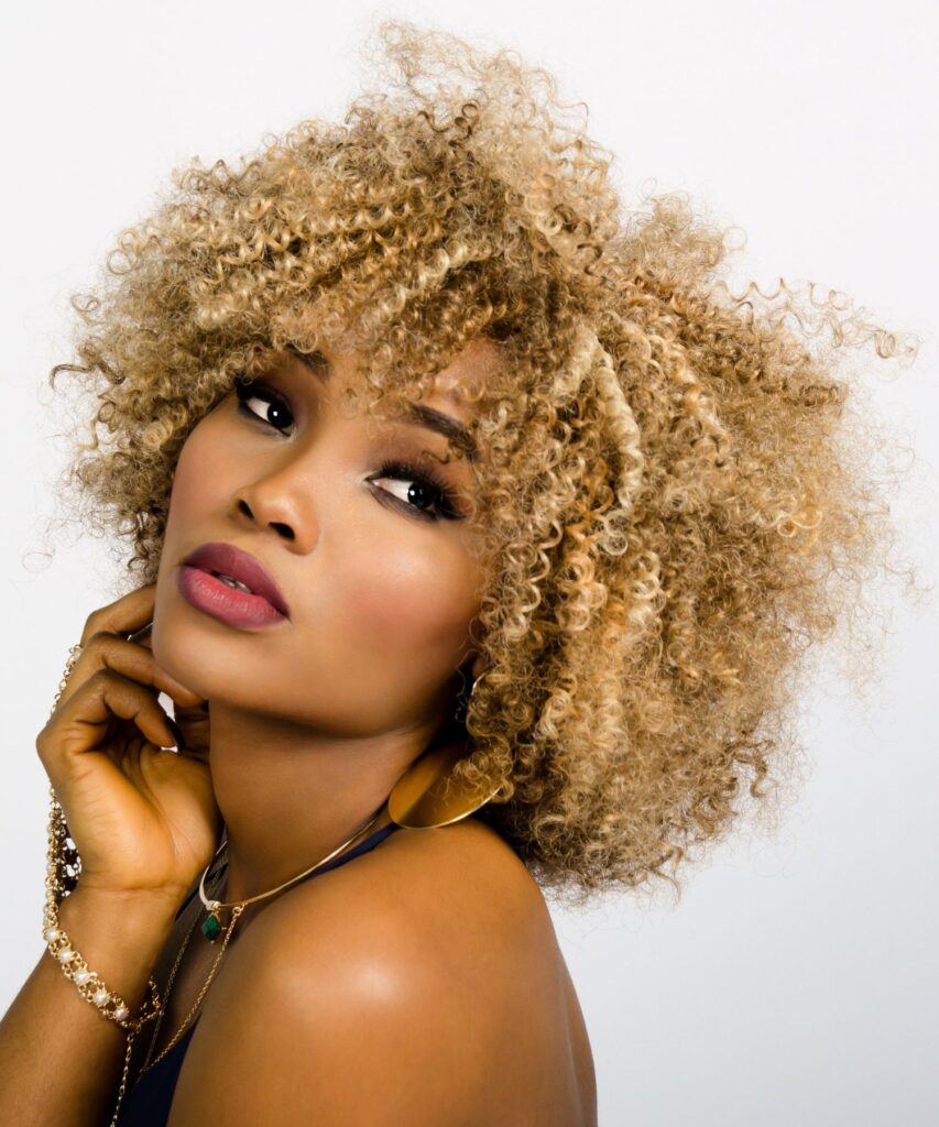 Blonde curls need moisture, so don’t skip your deep conditioner! I’d style this look with neutral makeup and statement jewelry to let the hair do all the talking. If you’re ready to turn heads, this look is your girl.