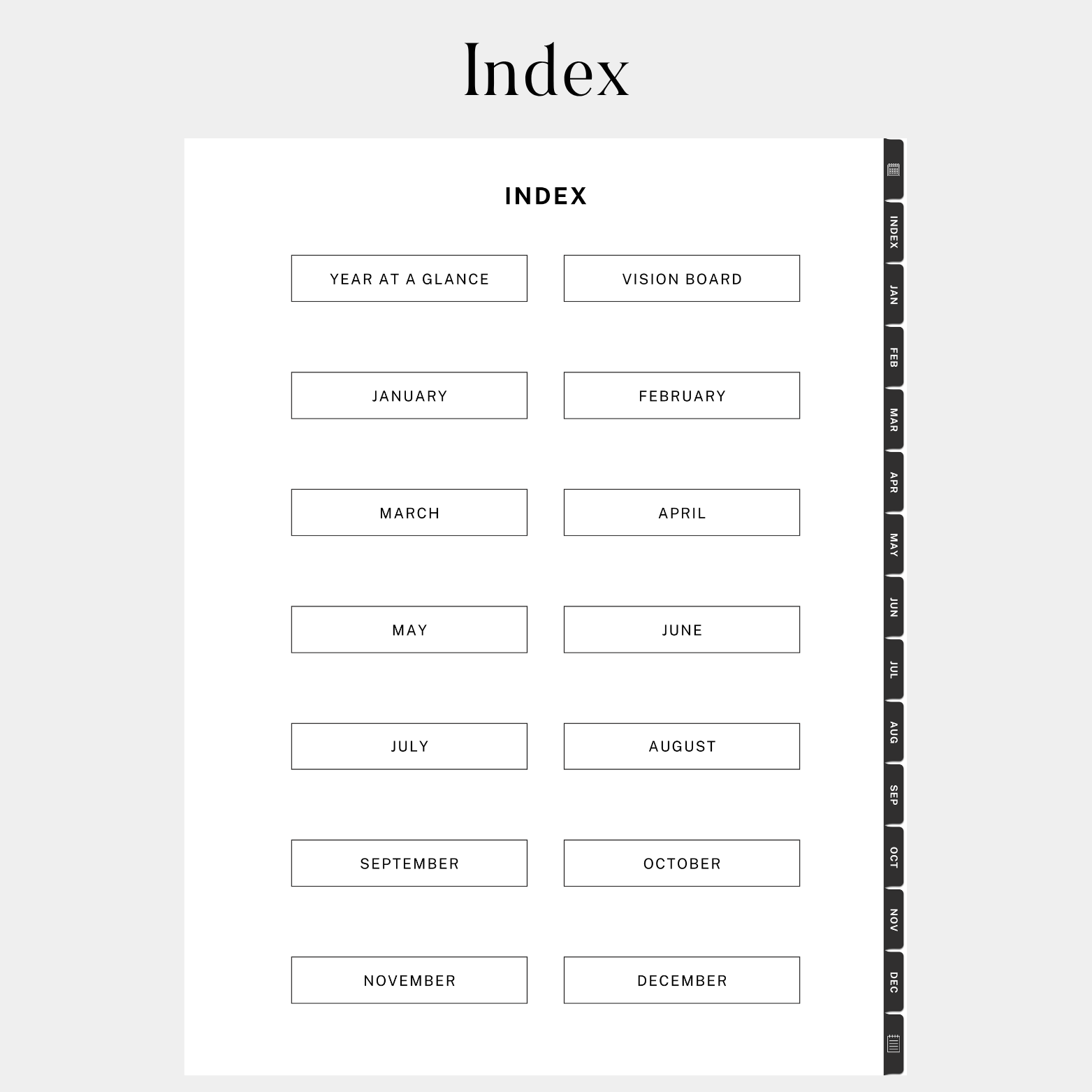 You’ll find everything you need inside: the year-at-a-glance, index, vision board, monthly calendars, goals, and notes sections. It’s your one-stop hub to stay organized.