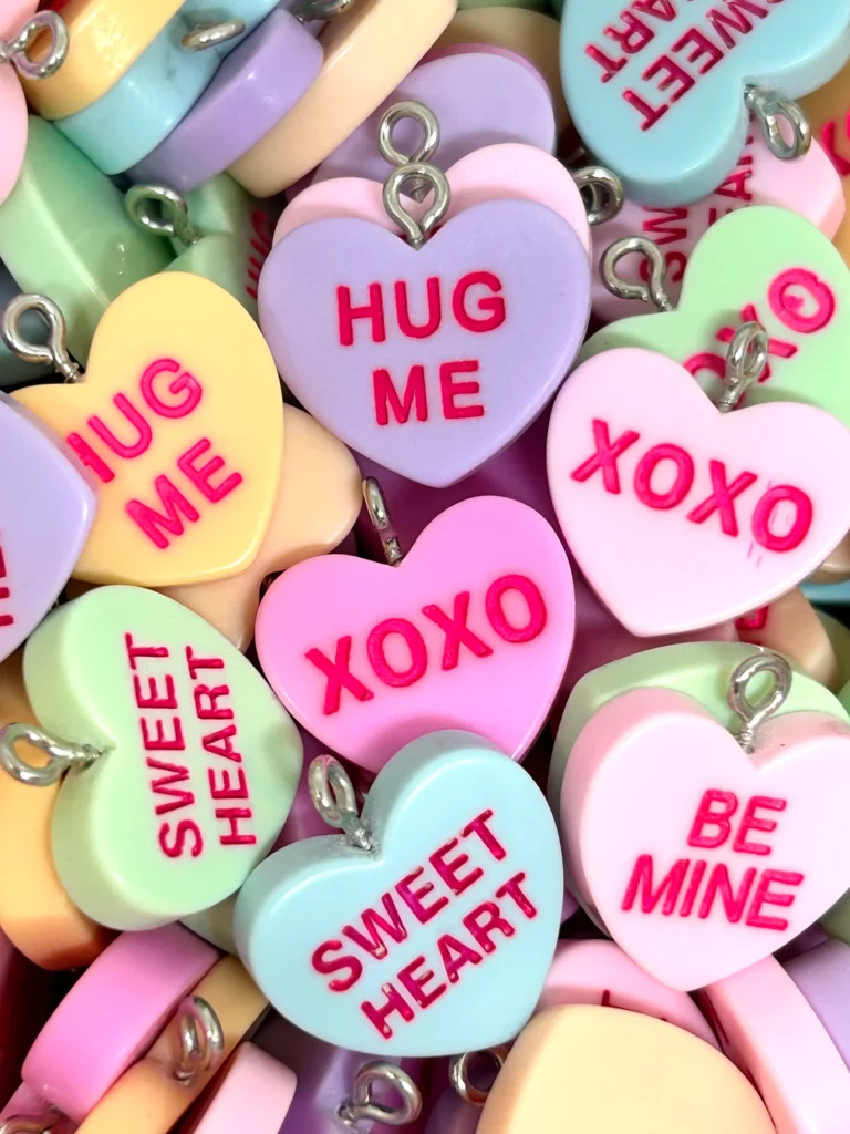 These heart charms are such a playful and creative party idea! I love the vibrant pastel colors and the cute phrases like “Hug Me” and “Sweetheart” that remind me of conversation candies.