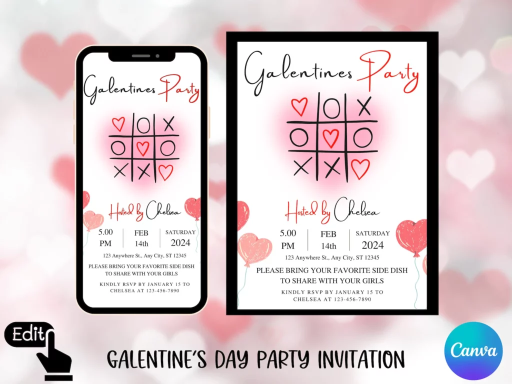These editable Galentine’s party invitations are a lifesaver for hosting a chic and organized celebration. I love the cute tic-tac-toe heart design paired with customizable text, making it super easy to add all your details.