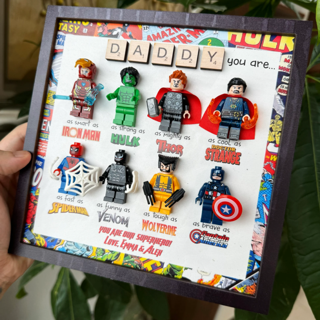 Celebrate your dad’s heroic qualities with this unique Lego superhero portrait. Featuring eight Lego figures representing different characteristics such as intelligence, strength, and courage, this customizable artwork is a playful yet meaningful addition to his space.