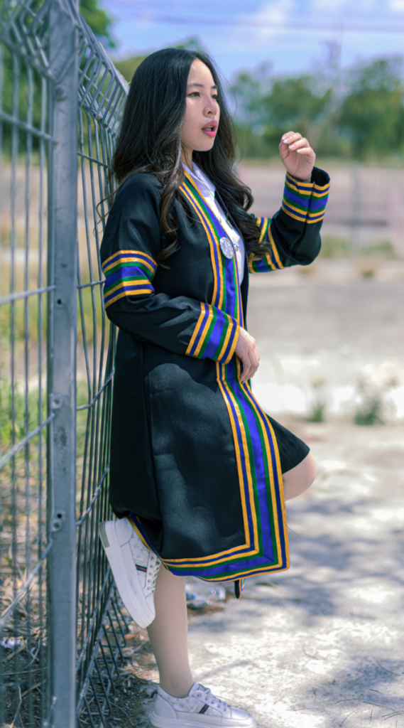 68. Casual yet composed, your graduation attire adorned with vibrant stripes, as you lean into the next chapter of your story with a smile as bright as your future.