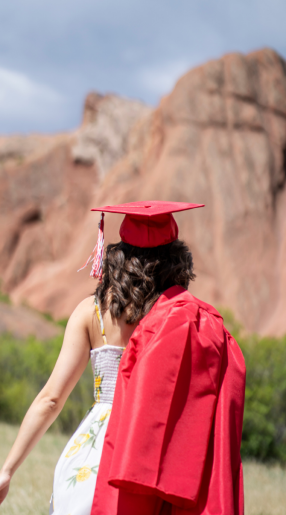 32. Step into the vast landscape of possibilities, your graduation gown catching the breeze, a back turned to the past, as you gaze ahead into the bright future, the horizon echoing your potential.