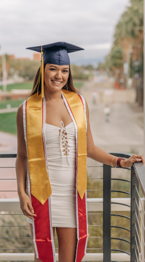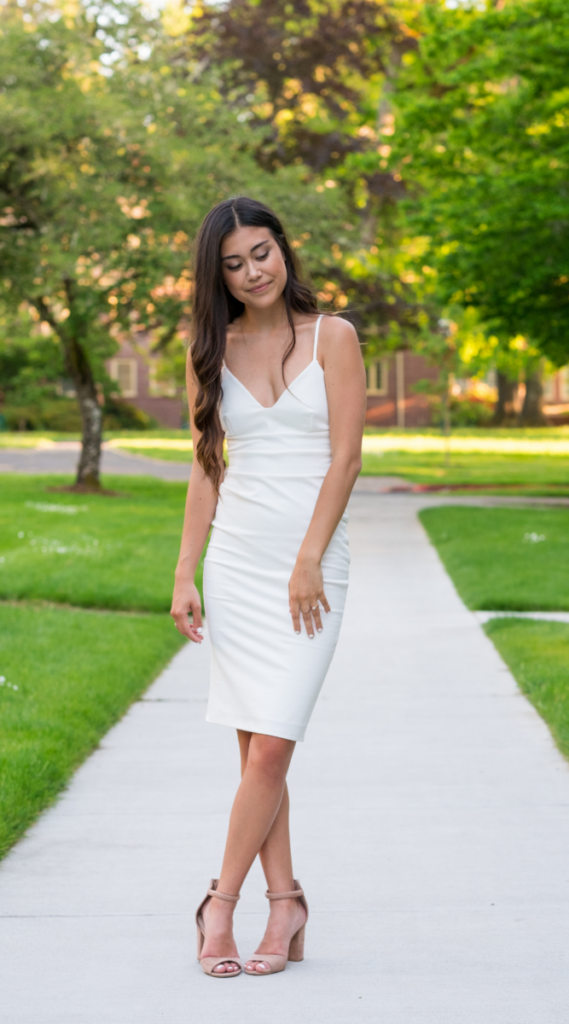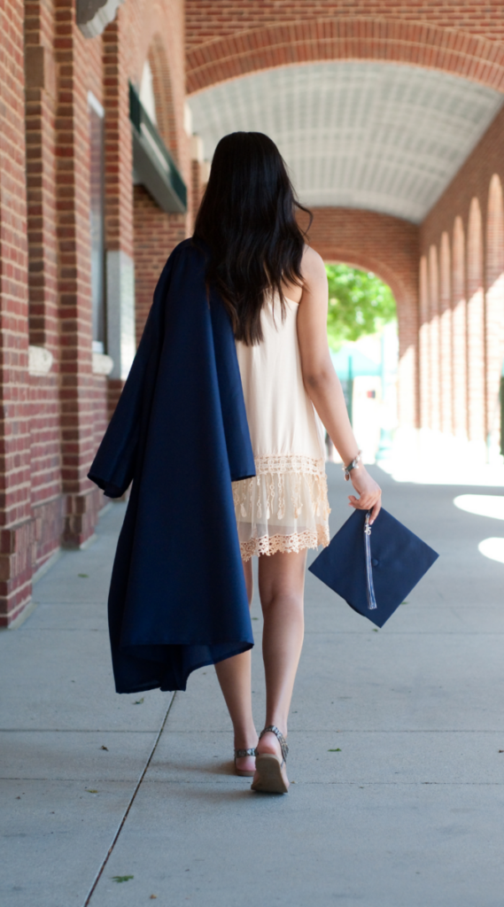 6. With a playful glance over to the site and your gown draped over your shoulder, you’re the definition of graduation chic in your vibrant dress.