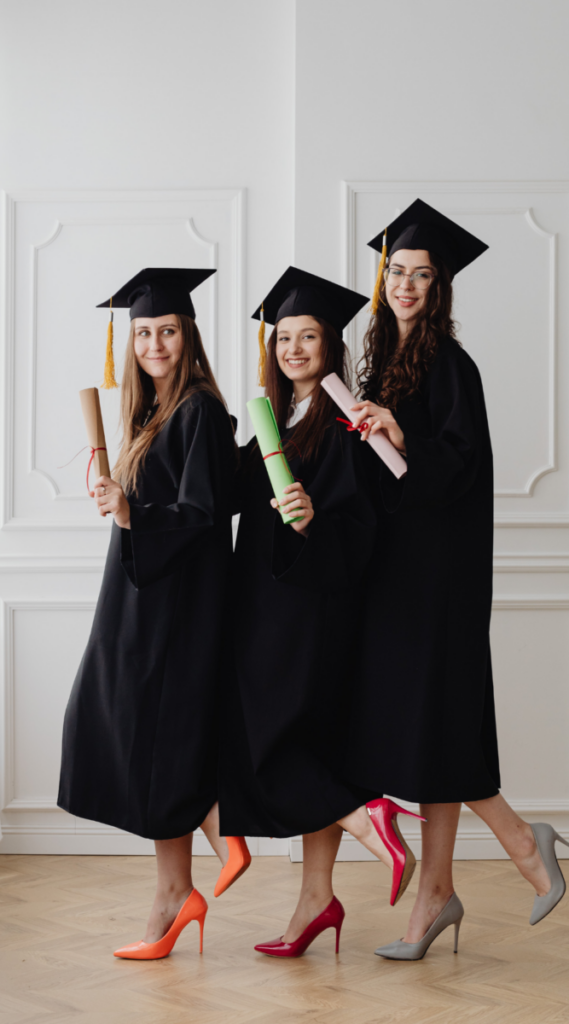 34. Celebrate friendship and shared victories, a triad of joy in cap and gown, diplomas clutched like batons in a relay race, poised on the threshold of diverse paths, each wearing success in her own unique color.