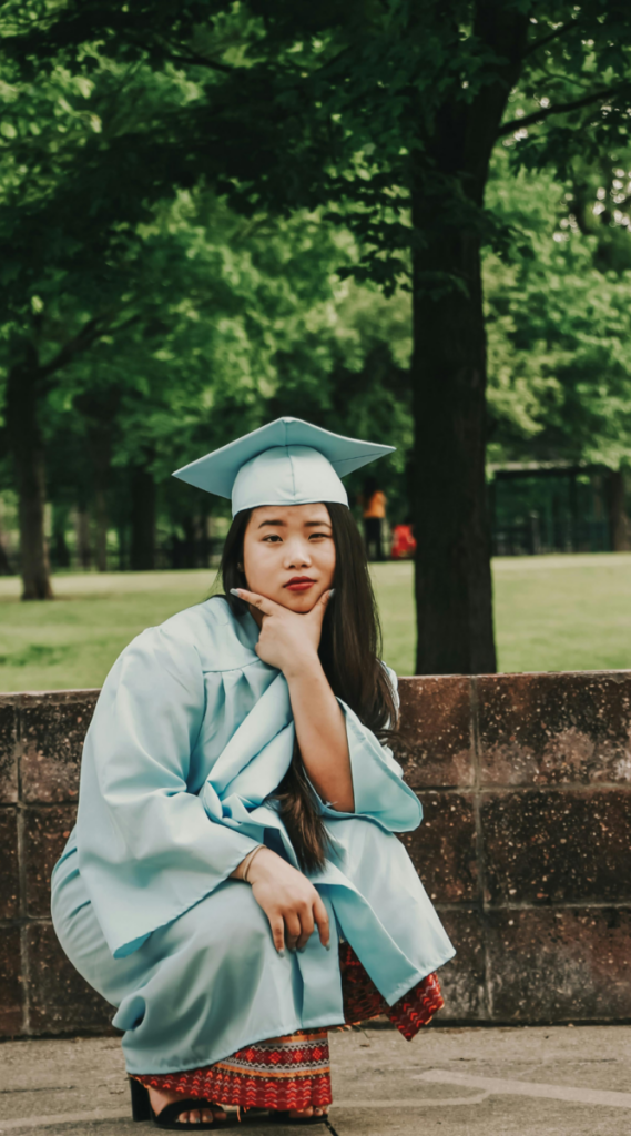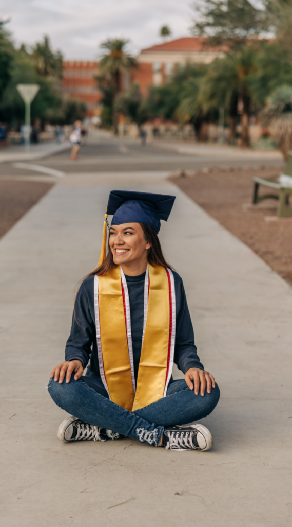 49. Sit with relaxed anticipation in the center of campus life, your graduation cap a testament to the wisdom gained and the casual confidence of one who is ready to roll into a bright future.