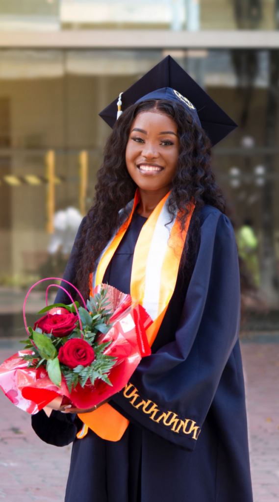 61. Embrace the bloom of achievement with a radiant smile, your graduation stole draped elegantly over your shoulders, a bouquet of roses cradled in your arms—a symbol of the growth and beauty that awaits.