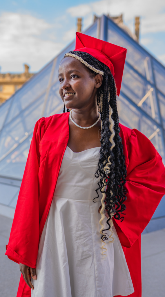 62. Stand tall in the bold hue of passion and power, your graduation cap perched proudly atop traditional braids, as you gaze forward with the wisdom and grace of an academic warrior.