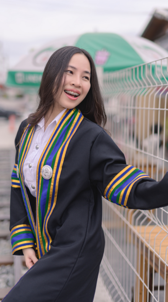 51. Stand amidst nature’s backdrop, your graduation sash a ribbon across the rustic charm of your attire, a bright smile and carefree spirit celebrating your day of joyous accomplishment.