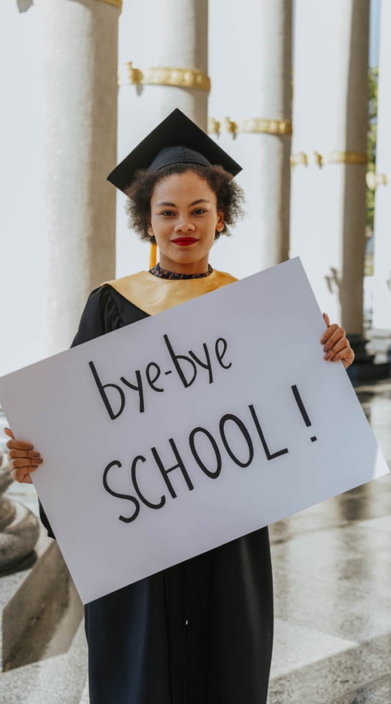 70. With a bold sign exclaiming your farewell to academia, your vibrant expression and colorful stole add a touch of whimsy to the gravity of your graduation day.