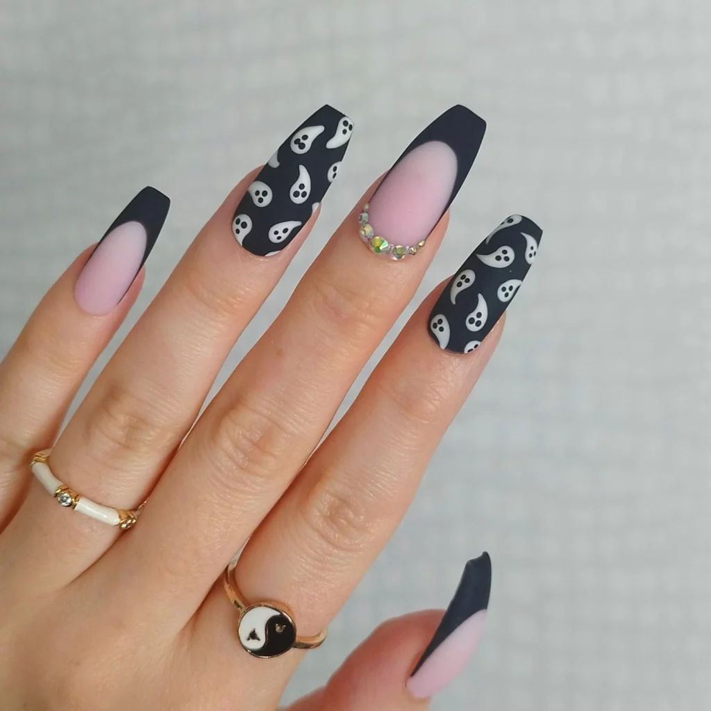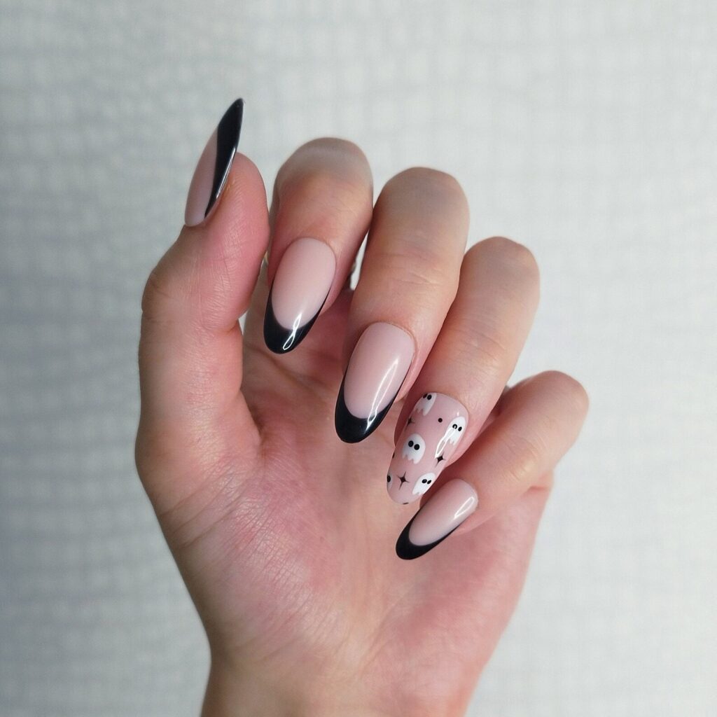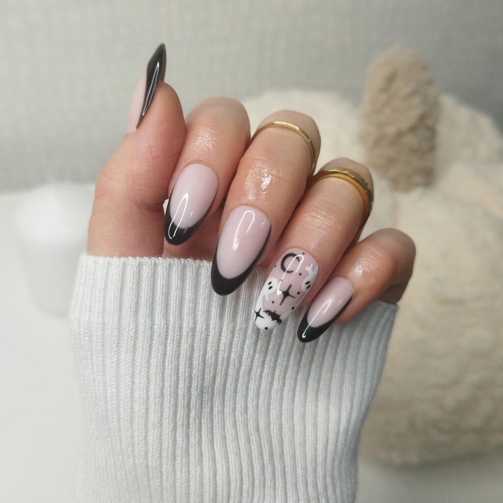 I’m loving the simplicity of these sleek black French tips paired with a cute accent nail covered in tiny white ghosts. The contrast between the nude base and the glossy black tips is just so chic and perfect for fall.