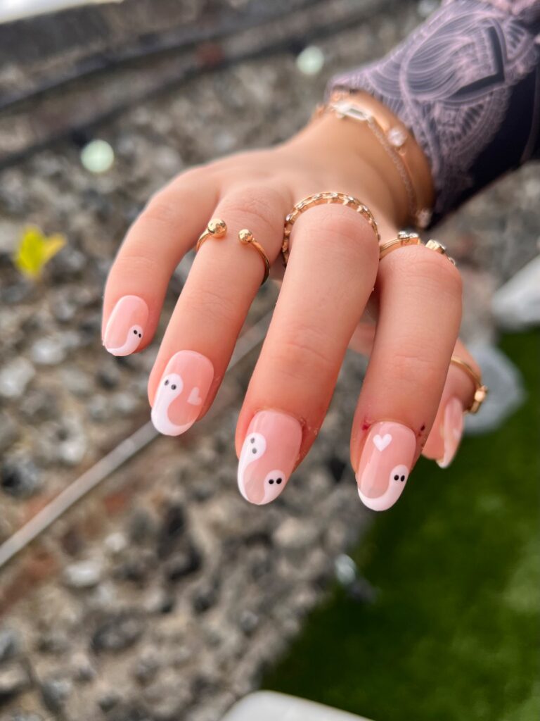 I’m completely charmed by these nails with their cute little ghosts swirling into yin-yang shapes over a soft pink base. The tiny white hearts mixed in with the ghosts make the whole look feel sweet and flirty, while still giving off those fun Halloween vibes.