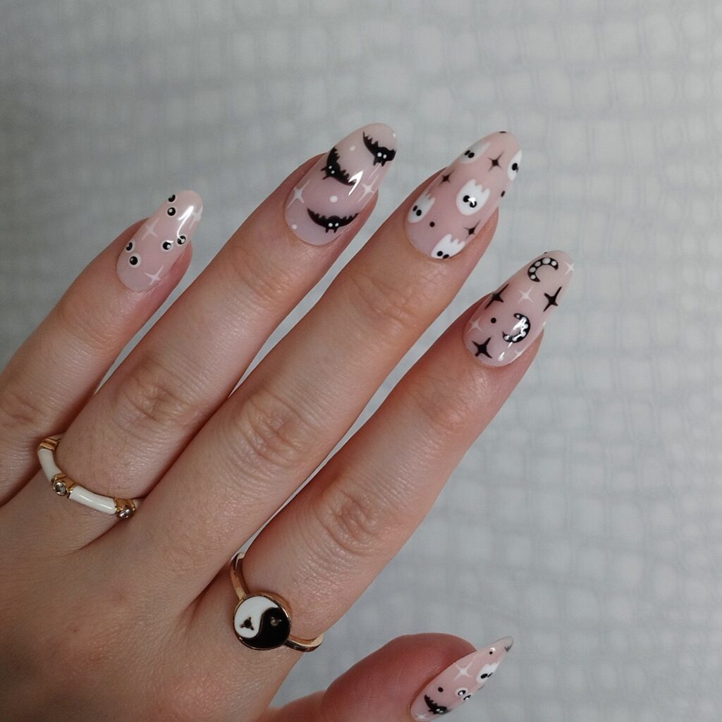 I’m obsessed with how playful these nails look, filled with tiny ghost faces, bats, and stars scattered over a soft nude base. The designs are so cute and cartoony that they make me smile every time I look at them, and I can totally imagine these nails being a conversation starter wherever you go!