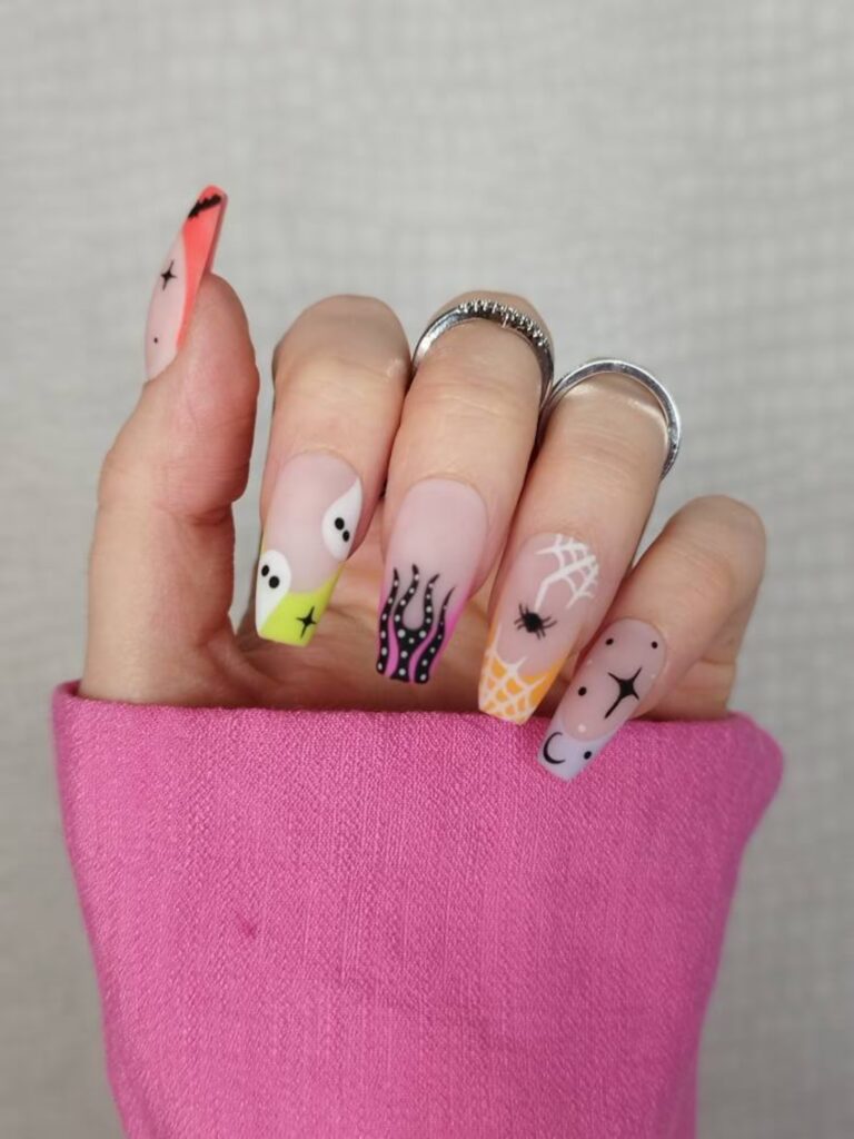 How fun are these nails with all their pops of neon and cute spooky details? I’m loving the mix of bright orange, lime green, and purples, plus the flames, spiderwebs, stars, and googly eyes all scattered across each nail like a Halloween carnival.