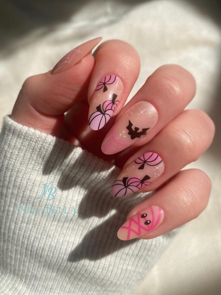 I’m completely in love with this softer take on Halloween nails, featuring pink pumpkins, bats, and even a little pink mummy. The way the pink and black designs pop against the natural base makes everything look cute and trendy rather than spooky.